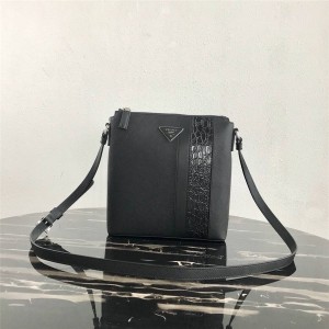 P家男包新款Saffiano真皮斜跨包单肩包2VH089编号Prad* 专柜最新款男士2VH089斜挎包到Saffiano皮革材质+鳄鱼皮饰边,金属配件,可调式皮革肩带主隔层拉链➕包身内部拉链+内部徽..