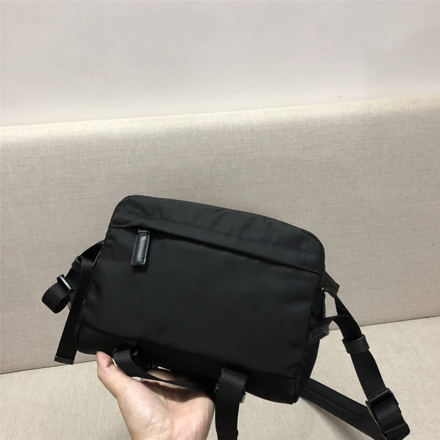 Prada斜挎包,织物和小牛皮材质,金属配件,可调式尼龙肩带,带肩垫,双向拉链主隔层,正面拉链袋,内部贴面口袋,尼龙衬里,内部金属徽标铭牌,外部涂珐琅三角形金属徽标。尺寸:21×15×8 ick
