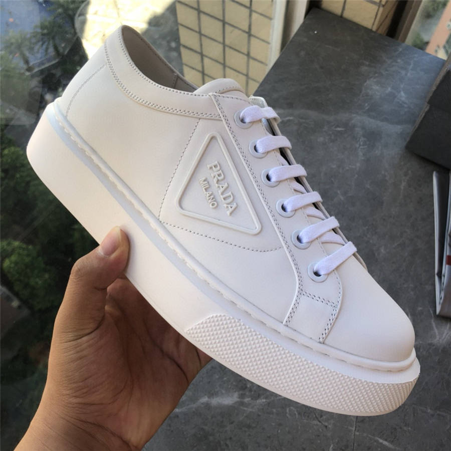 原单正品 新款 Prada 普拉达运动男鞋 系带小白鞋 官网在售 3.5厘米厚底 面是进口小进口牛皮 舍口热印徽标 内里小牛皮 底是原厂EVA橡胶射出轻质条格防滑底 脚感舒服 码数39 40 41 42 43 44 标准皮鞋码 原盒包装。eek
