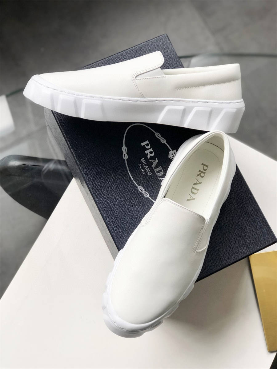 EKK Prada,最新款一脚蹬,意大利专柜展示款,领先其他专柜上市,轻奢小牛皮鞋 百搭款 这款套穿式皮革运动鞋采用时尚线条设计。